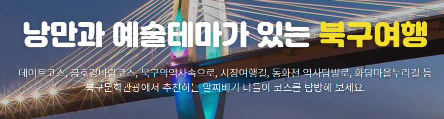 낭만과 예술테마가 있는 북구여행 데이트코스, 금호강바람코스, 북구의역사속으로, 시장여행길, 동화천 역사탐방로, 화담마을누리길 등 북구문화관광에서 추천하는 알짜배기 나들이 코스를 탐